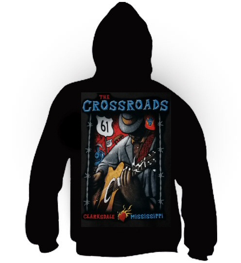 Black zipper front hoodie with small Delta Blues Museum logo on front lapel area. Large, colorful Crossroads graphic on the back.