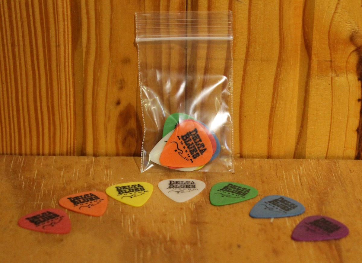 Assortment of 5 guitar picks featuring the Delta Blues Museum Logo.
